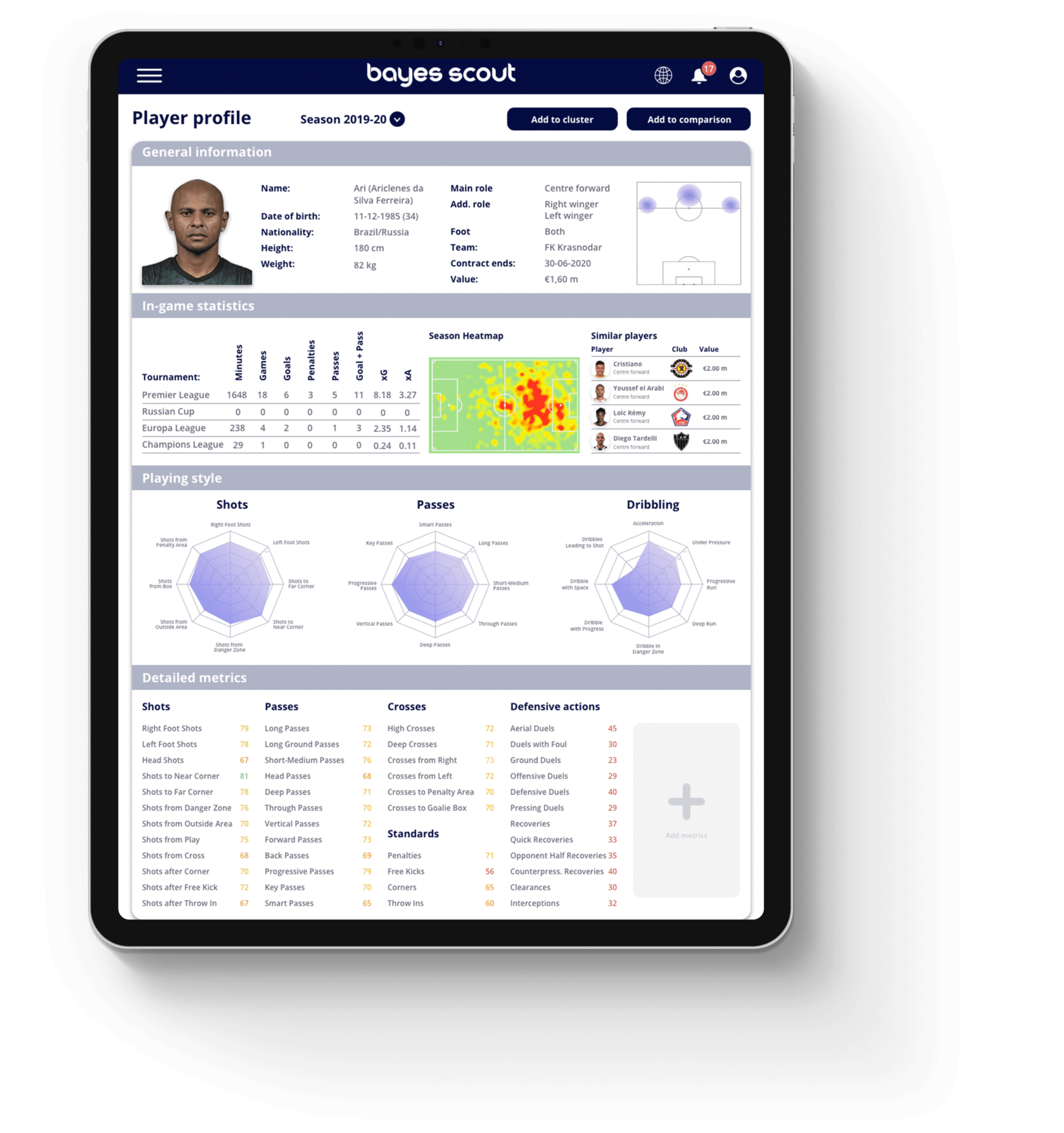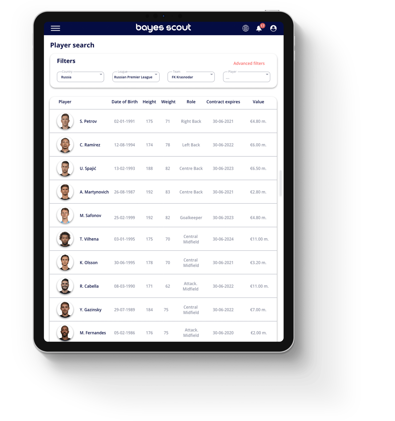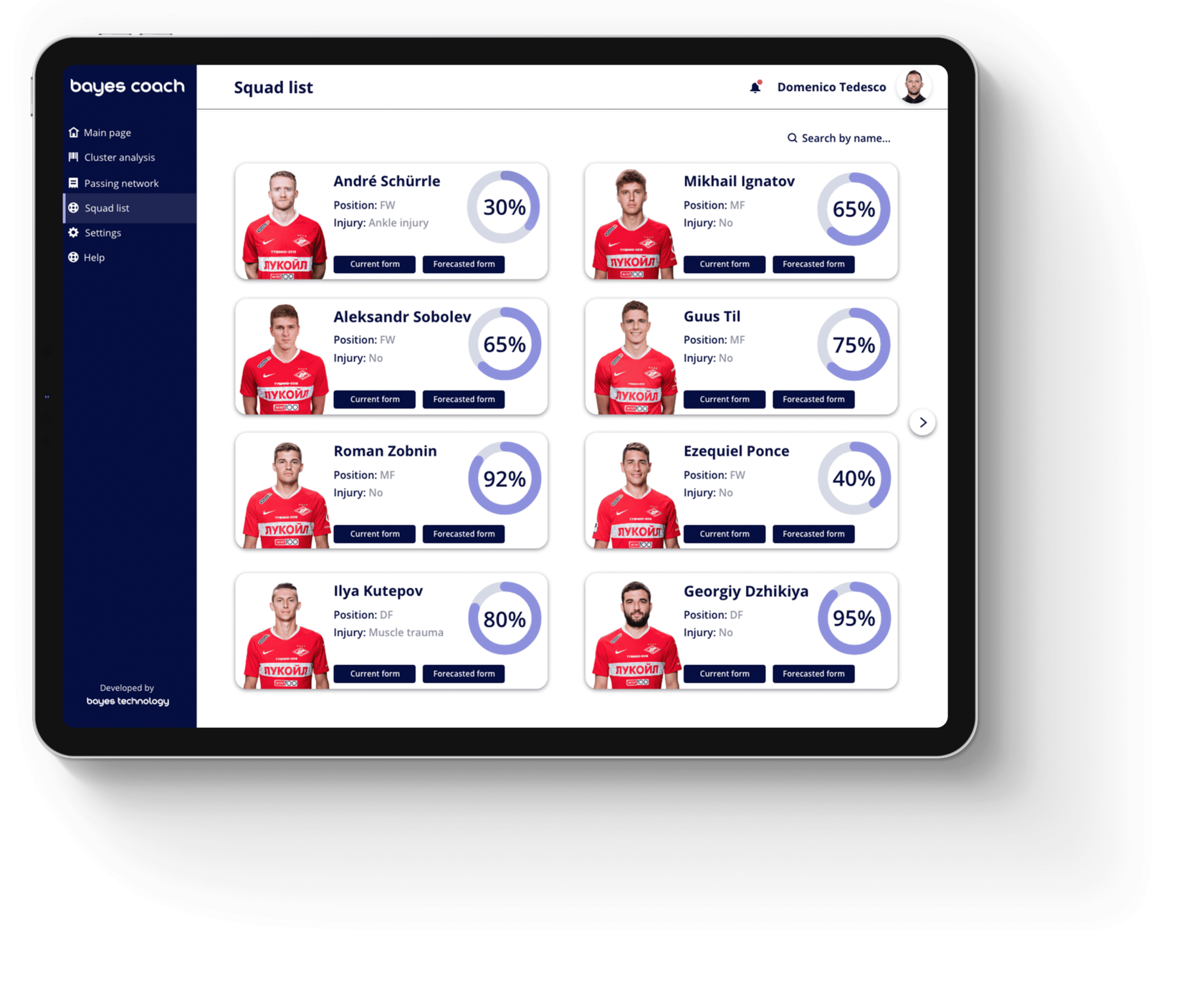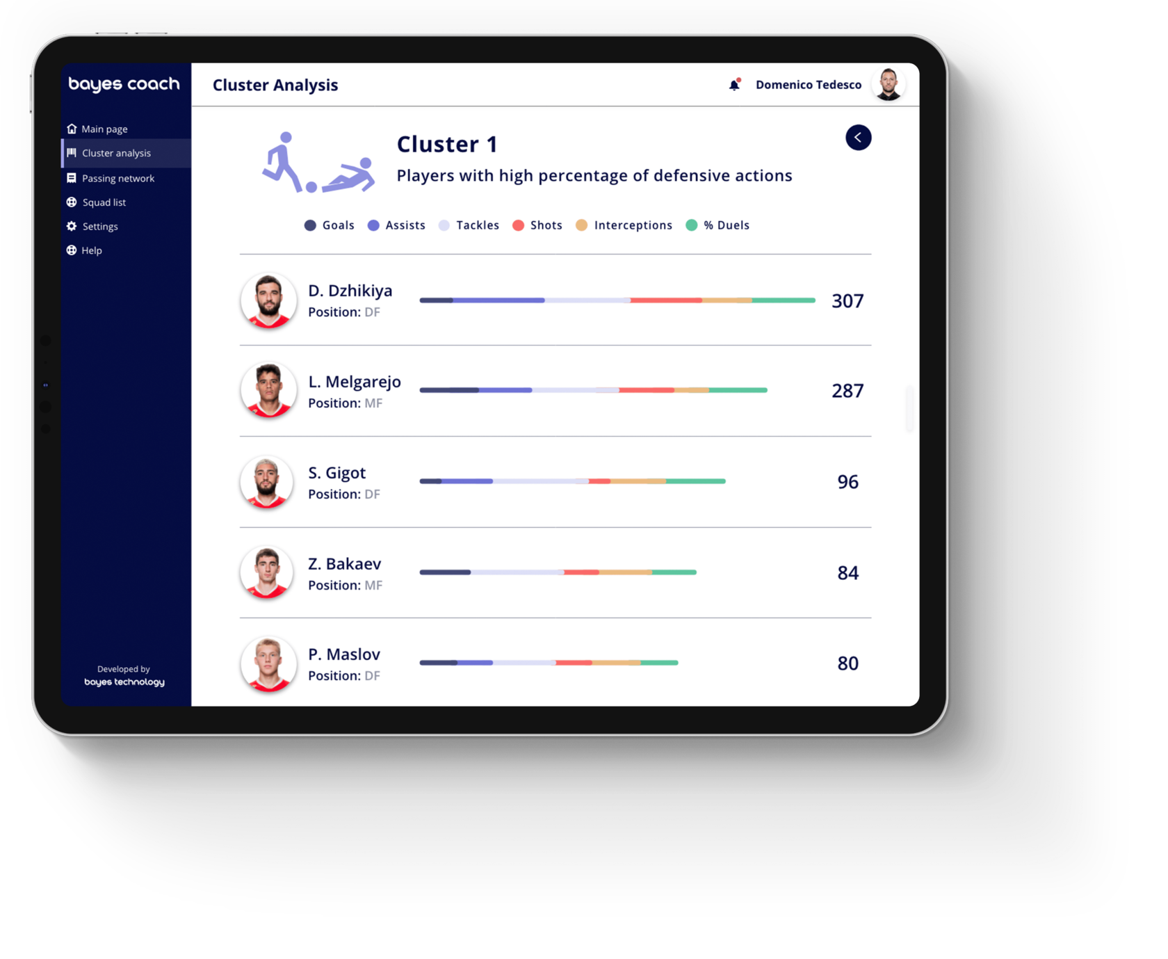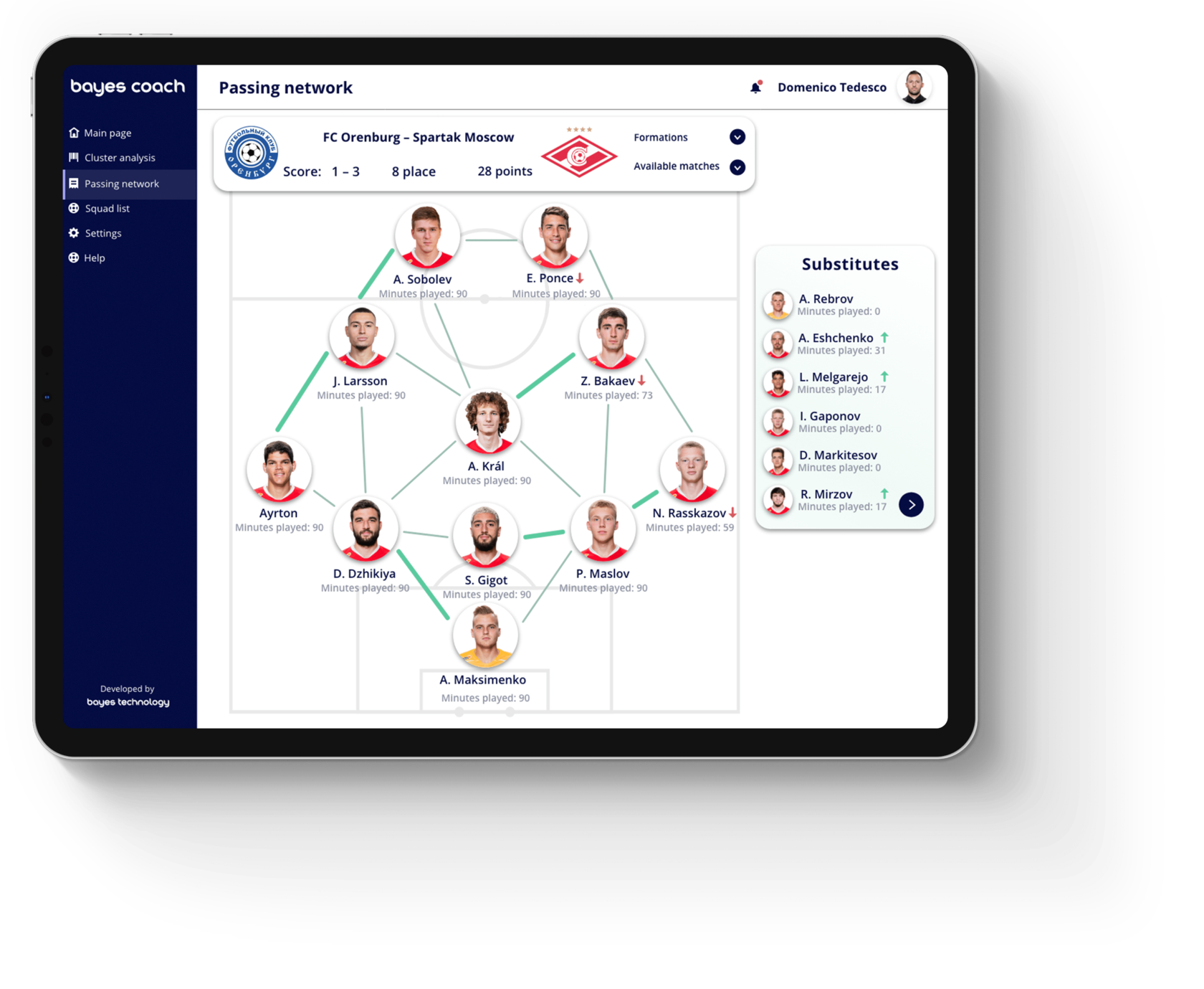 Under the umbrella of Bayes Technology, we have developed two complementary platforms, Bayes Coach and Bayes Scout, that include a wide range of analytical instruments for the development of your football club: from optimising the training process to scouting prospective players